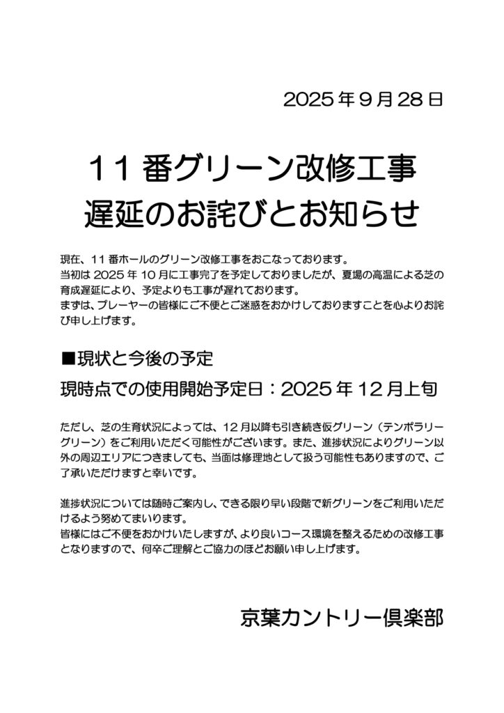 当初は2025年10月の工事完了を予定しておりましたが、夏季の高温により芝の育成が遅れ、工事全体も予定より遅延しております。プレーヤーの皆様にはご不便ならびにご迷惑をおかけしておりますことを心よりお詫び申し上げます。