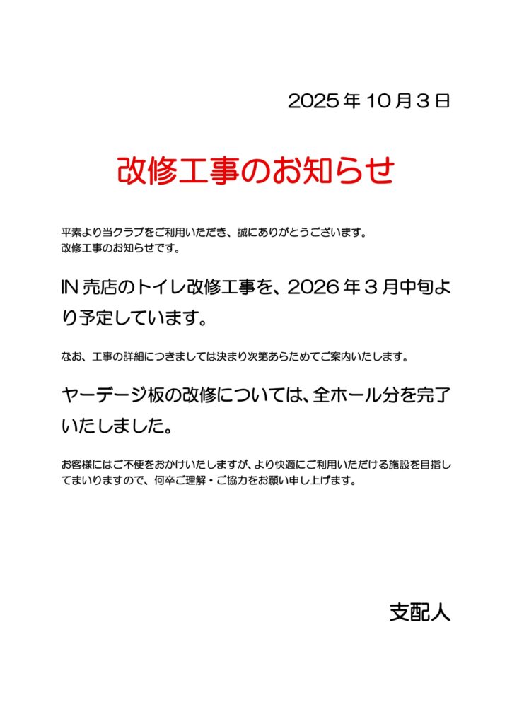 INコース売店のトイレ改修工事のお知らせ