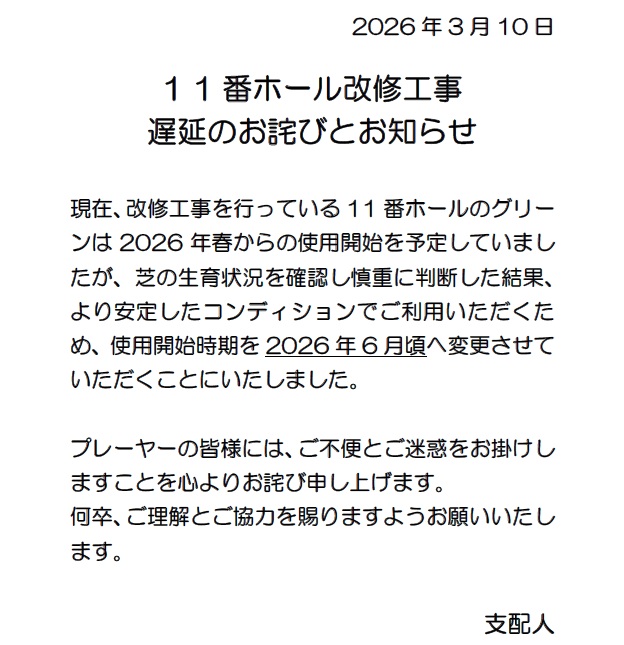 11番ホール改修工事 遅延のお詫びとお知らせ
